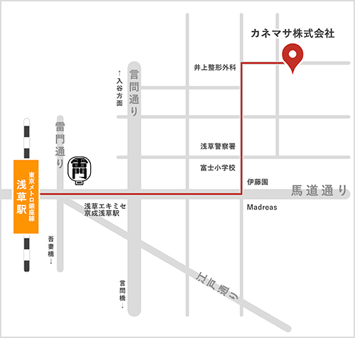 東京メトロ銀座線、または東武スカイツリーラインの「浅草駅」を出て、馬道通りをまっすぐ三ノ輪方面に歩き、言問通りも通り越します。