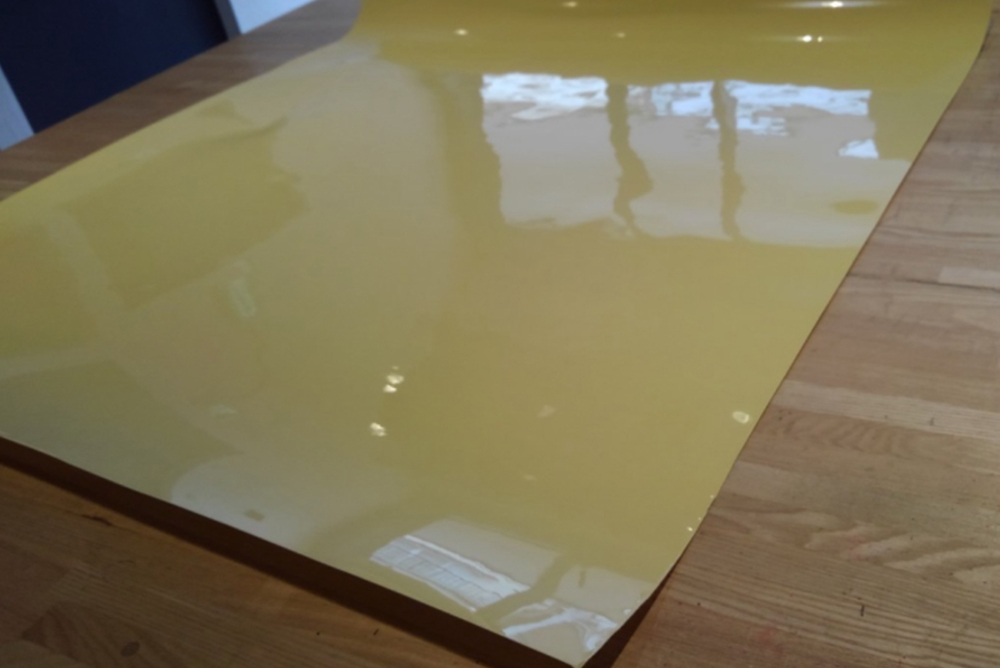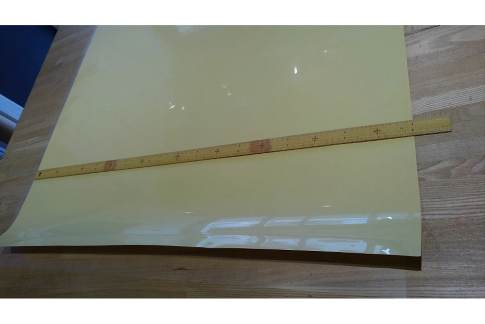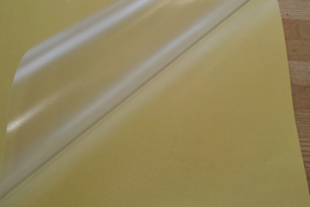 PP(ポリプロピレン)製のフィルムでR面に使用する事によりハリが出ます。麻芯同様に、靴ではベルトがあるデザインのベルト部分の内部に使われたりします。 感触としてはクリアファイルの感触・ハリ感に似ています。