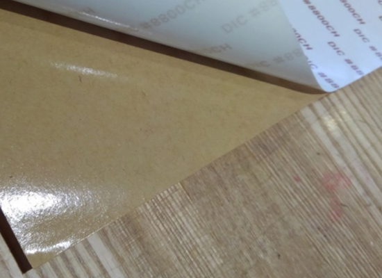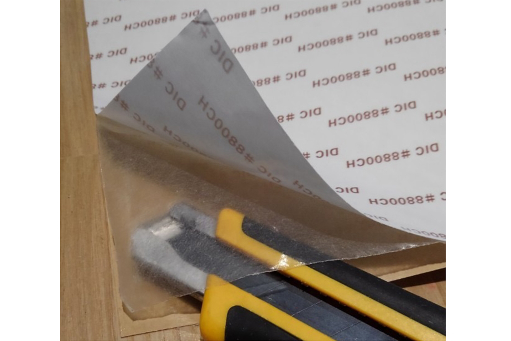 8800CHはDIC株式会社(旧 大日本インキ化学工業株式会社)製の強力WPです。剥離紙にサンドされた不織布の両面には強力な糊が付いていて、金属同士でも接着出来る程の優れものです。片面の剥離紙を剥がして素材①に貼り、もう片面の剥離紙を剥がして素材②を貼ります。ただ、ワッペン加工品と同様に油分を含む面や防水・撥水加工品・ザラザラした面への接着は強度がかなり下がります。シート状になっている為、自由な形にカットする事が出来るので、靴業界でも長年御愛用頂いております。