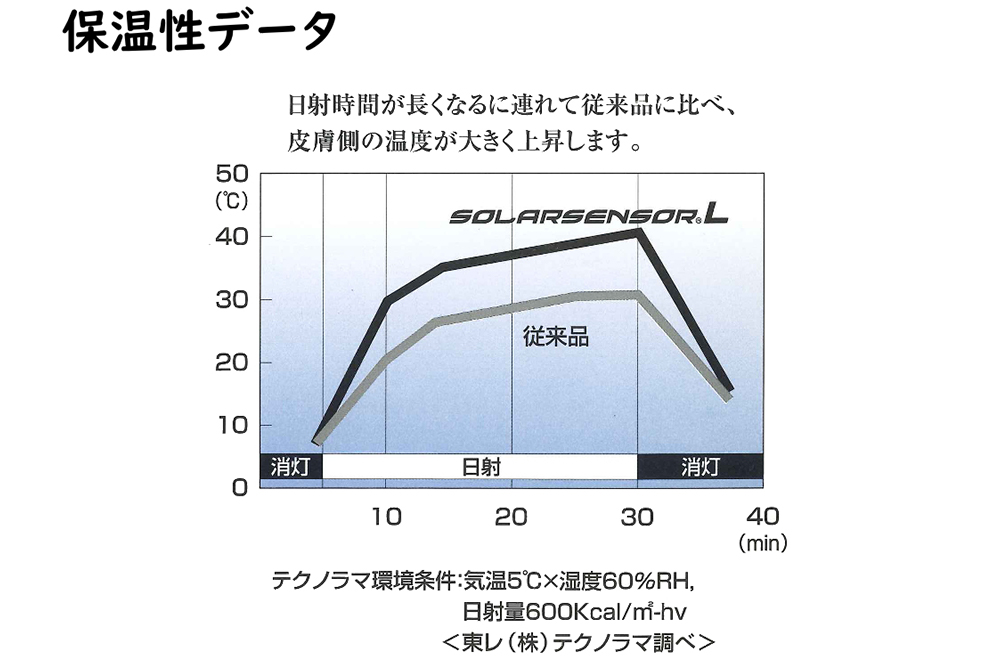 ソーラーセンサーは表面生地に東レのソーラーセンサー®Lを使用し、高い保湿と制電性の効果があります。